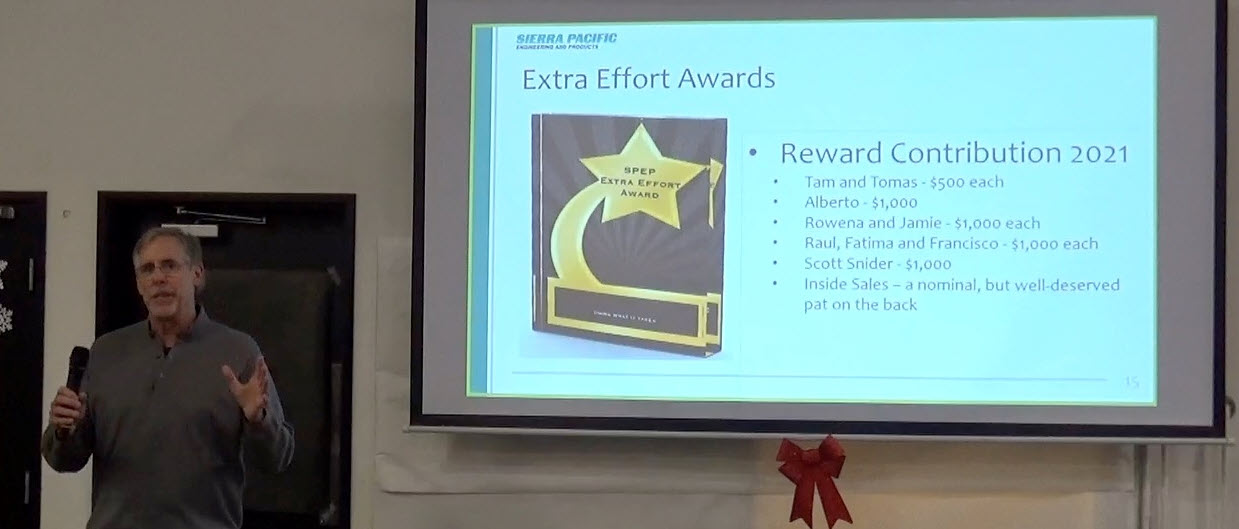 The members of our SPEP team work extremely hard every day, but there were some special individuals who worked even further beyond their responsibilities and expectations. These members were highlighted during the yearly recap and received SPEP’s coveted Extra Effort Award. This lets them know that their hard work and dedication have not gone unnoticed and should be celebrated. Our CEO, Dave Mochalski, personally congratulated each awardee by briefly talking about how their contributions helped the company’s improvement throughout 2021. There were many recipients for this Extra Effort Award across multiple departments of the company, as our success as a company is always a team effort. Not only were the winners of the Extra Effort Awards highlighted for their impressive work, but we also spotlighted people celebrating milestones in their tenure with the company. When someone hits their 10-year or 20-year anniversary with the company, that level of commitment is just as exciting as any other achievement. These employees were awarded luxury gifts as a small token of appreciation for all their hard work over many years of service.