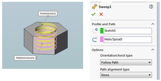 - Generate the Custom Thread: Create a sweep or swept cut to make your custom thread. At this point, you have modeled it and are almost finished.